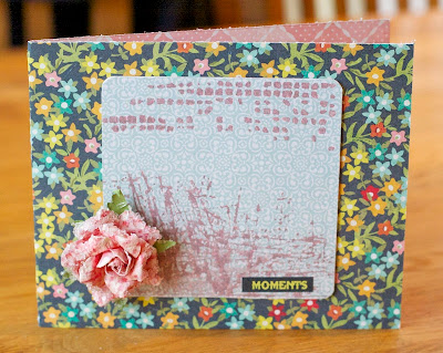 Selve kortet er laget av Crate-arket fra kitet (Handpicked, Farmhouse Collection). Jeg har limt rester av mønsterarket fra Studio Calico (Bundle) på chipboard-biter som jeg hadde liggende. Stemplet litt på arket - fargela Tim Holtz-stempelet med Distress Stains - og brukte også Stains over stensilen fra The Crafter's Workshop. En blomster måtte til som ekstra pynt på et så fargerikt og blomstrende mønsterark, og små stickers fra Crate (også Farmhouse Collection) ble små titler til kortene. Alltid kjekt å ha kort liggende, til alle anledninger!